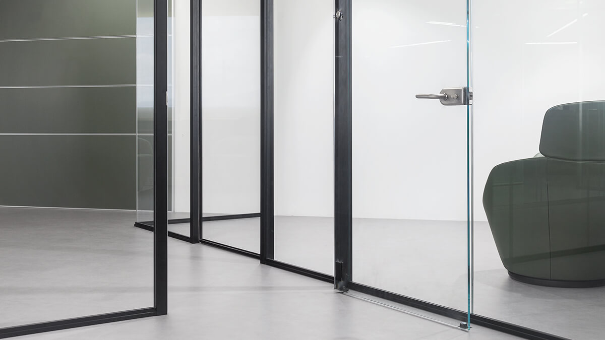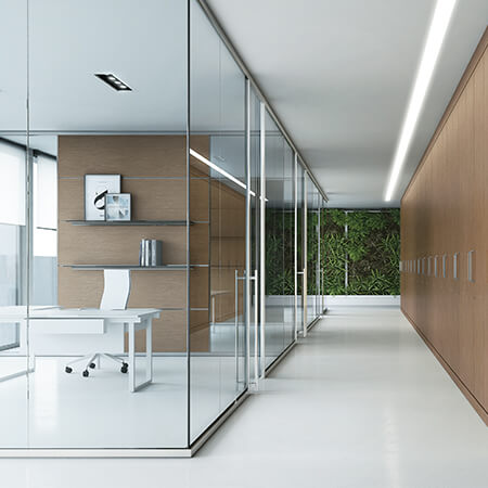 La parete divisoria K EVO è un sistema a vetro singolo con profili cavi singoli con regolazioni variabili, in grado di assorbire le tolleranze dimensionali delle pareti. Le pareti in vetro K EVO sono stratificate e possono essere trasparenti, incise, serigrafate o decorate con pellicola adesiva.Il vetro stratificato garantisce un migliore isolamento acustico.